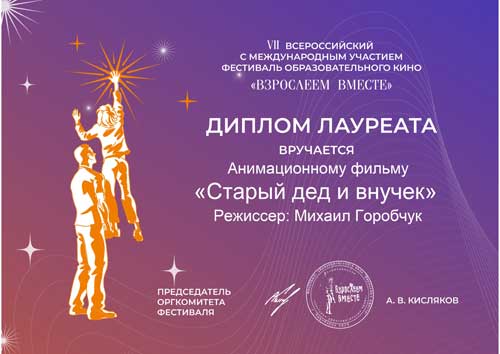 Продолжается триумфальное шествие по фестивалям анимационного фильма «Старый дед внучек», режиссер Михаил Горобчук. Пластилиновая анимация по мотивам известной притчи Льва Николаевича Толстого «Старый дед и внучек». Фильм об отношениях в семье и понимании старости, о важности личного примера в воспитании детей.