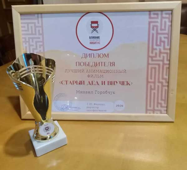 Диплом победителя в номинации «Лучший анимационный фильм» - «Старый дед и внучек» получил наш режиссер Михаил Горобчук на кинофестивале ВЛИЯНИЕ (АМБИТУС)